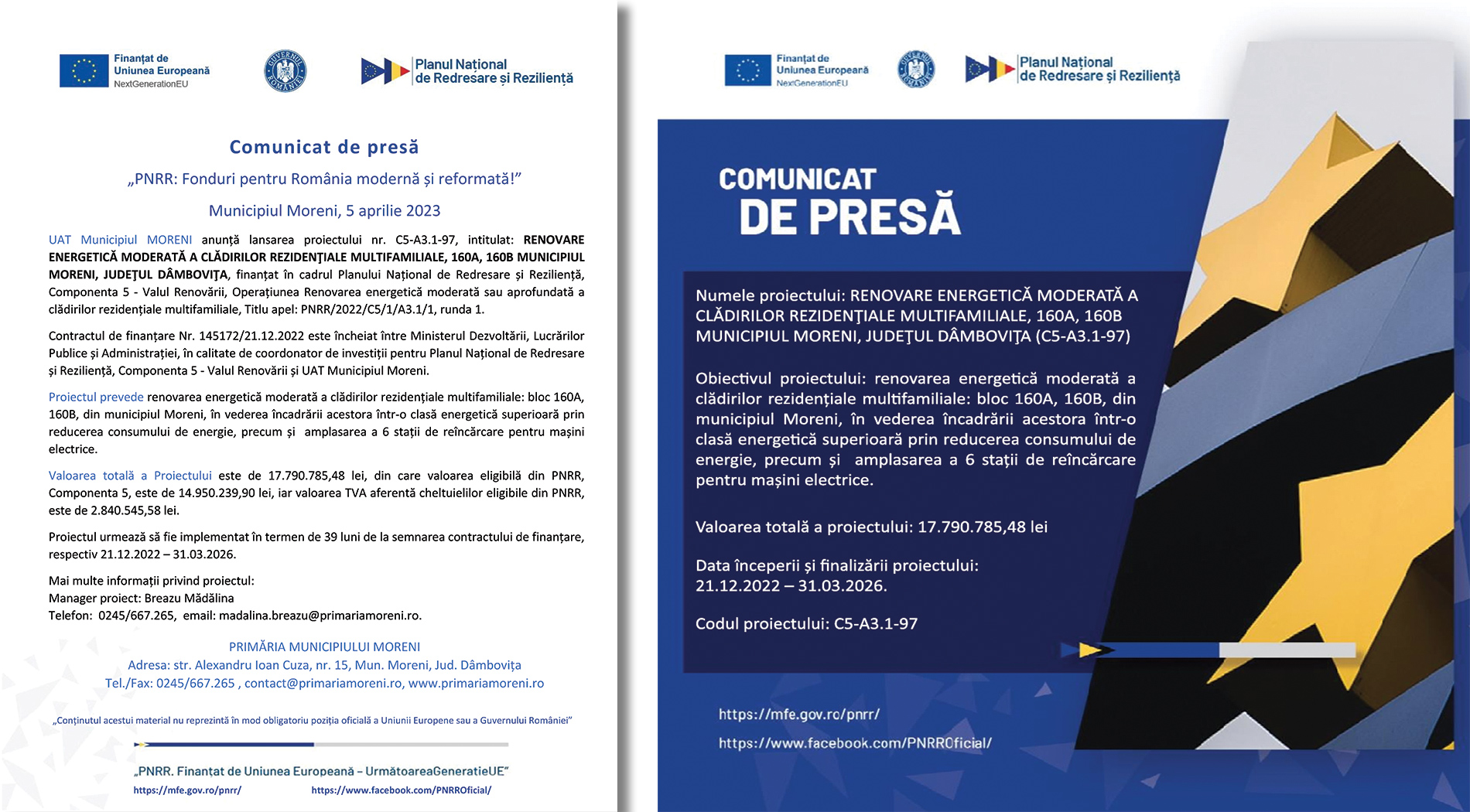 - Renovare energetică moderată a clădirilor rezidențiale multifamiliale, 160A, 160B Municipiul Moreni, Județul Dâmbovița