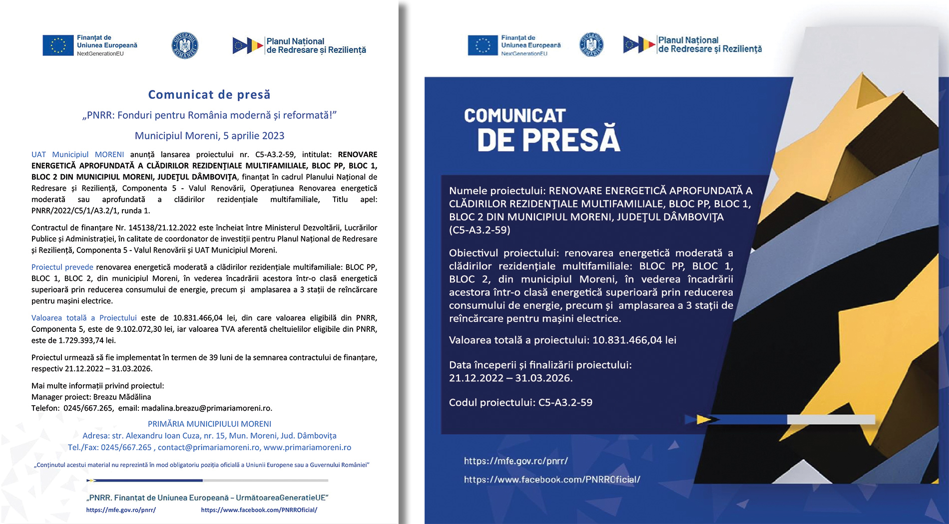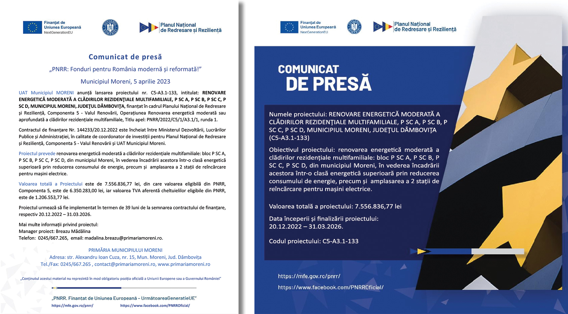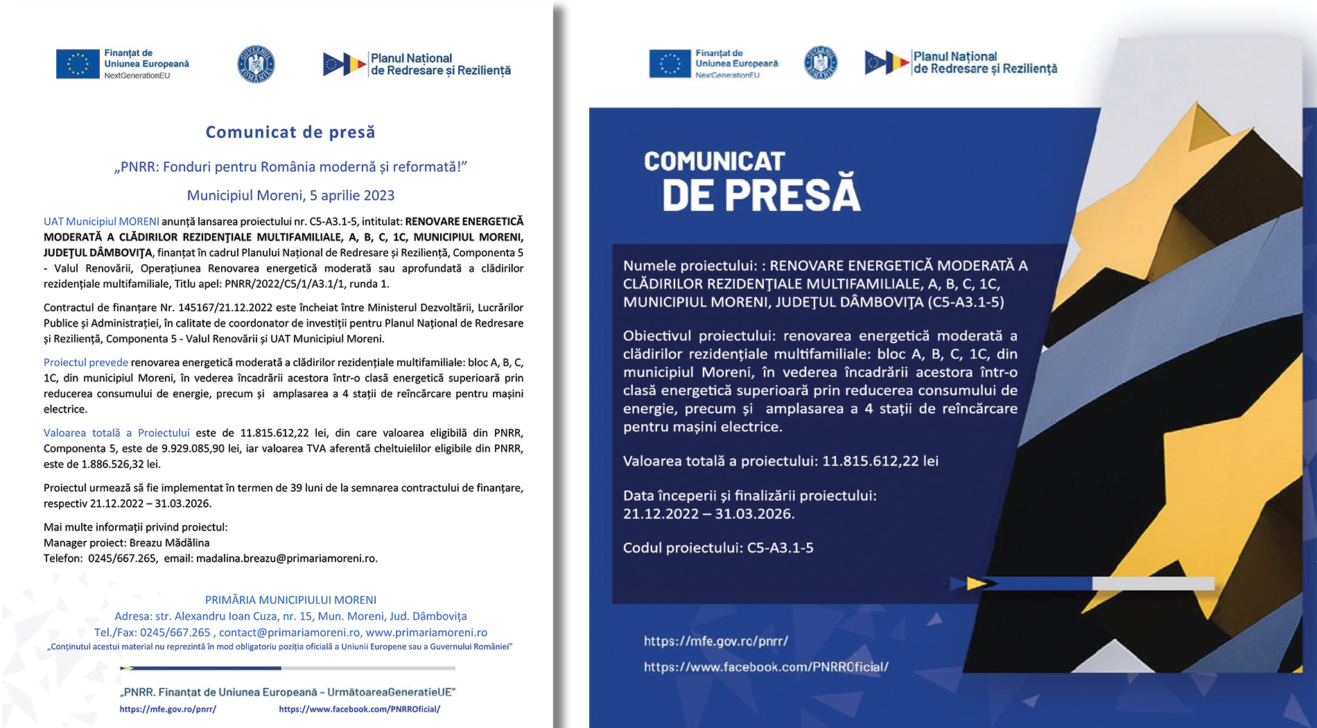 - Renovare energetică aprofundată a clădirilor rezidențiale multifamiliale, Bloc PP, Bloc 1, Bloc 2 din Municipiul Moreni, Județul Dâmbovița