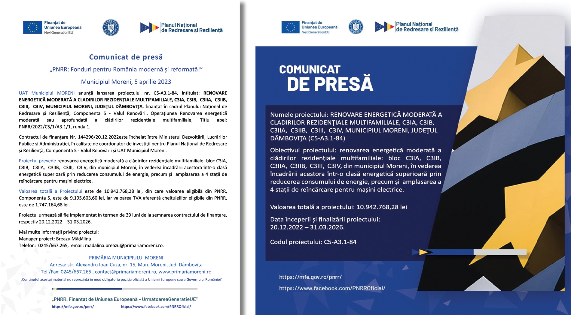 - Renovare energetică moderată a clădirilor rezidențiale multifamiliale, C3IA, C3IB, C3IIA, C3IIB, C3III, C3IV, Municipiul Moreni, Județul Dâmbovița