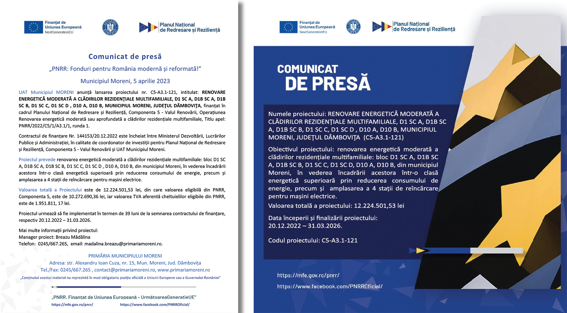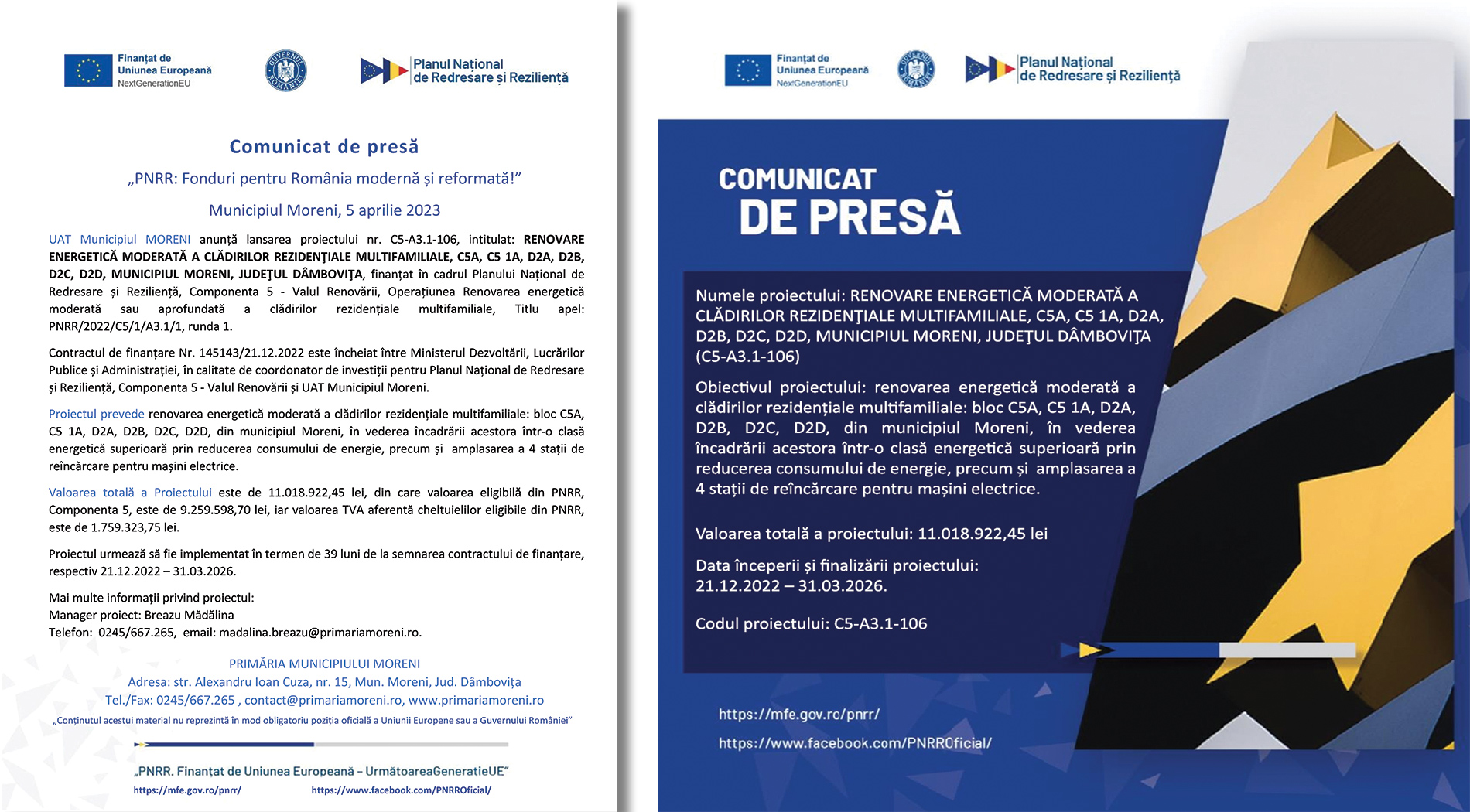 - Renovare energetică moderată a clădirilor rezidențiale multifamiliale, C5A, C5 1A, D2A, D2B, D2C, D2D, Municipiul Moreni, Județul Dâmbovița